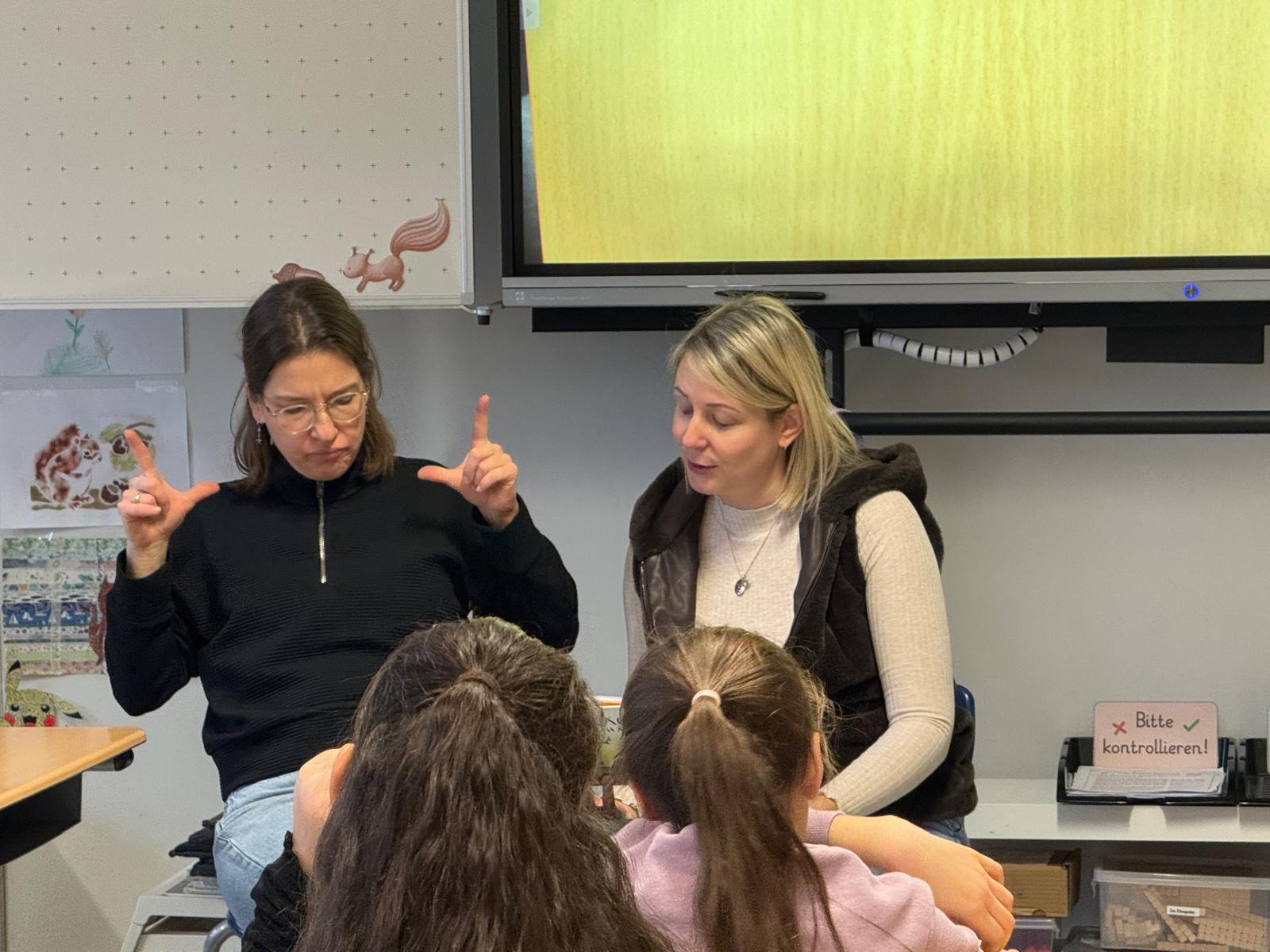 Eine besondere Form des Vorlesens erlebten die Schülerinnen und Schüler der Klasse 4e: Eine Mama las vor und eine zweite Schülermama „übersetzte“ das Vorgelesene in Gebärdensprache.
