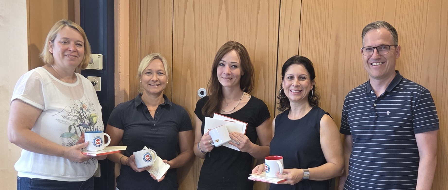 Mit dem Ende dieses Schuljahres verabschieden wir uns von wichtigen Personen an unserer Schule: unserer langjährige Elternbeiratsvorsitzende der Grundschule, Frau Sollmann (links), unsere langjährige stellvertretende Elternbeiratsvorsitzende der Mittelschule, Frau Kaiser (z.v.l.) und unsere Organisatorinnen des Schulobstprogramms, Frau Schwegler (z.v.r.) und Frau Faust (Mitte).