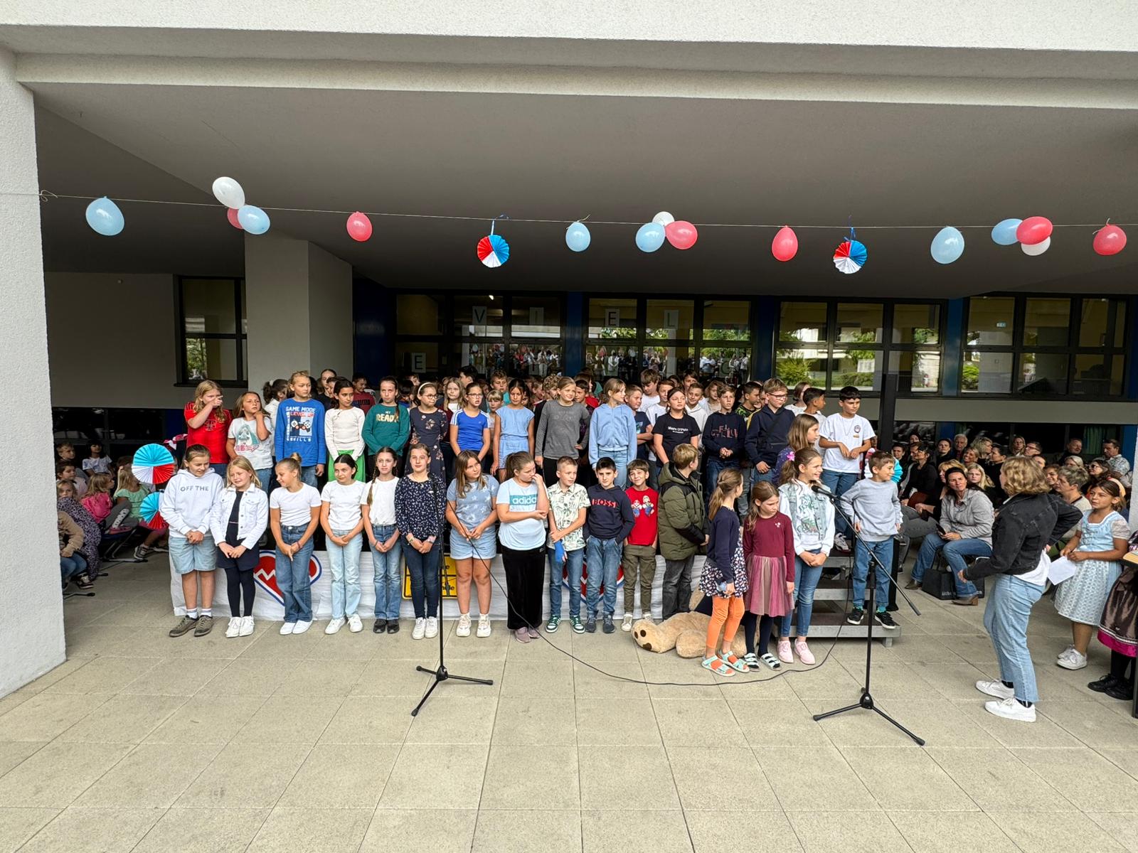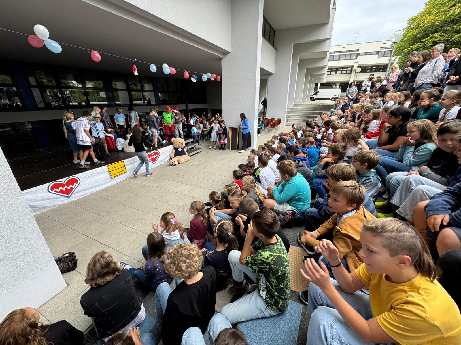Auch dieses Jahr kamen wieder zahlreiche Eltern zur Verabschiedung unserer Viertklässler in die Irlanda-Riedl-Grundschule. Da die Turnhalle nicht mehr zur Verfügung steht, fand die Feier dieses Jahr draußen im Atrium der Schule statt. Das Wetter spielte mit und so war es zwar kühl, aber es blieb zum Glück trocken und zum Ende ließ sich sogar die Sonne sehen …
